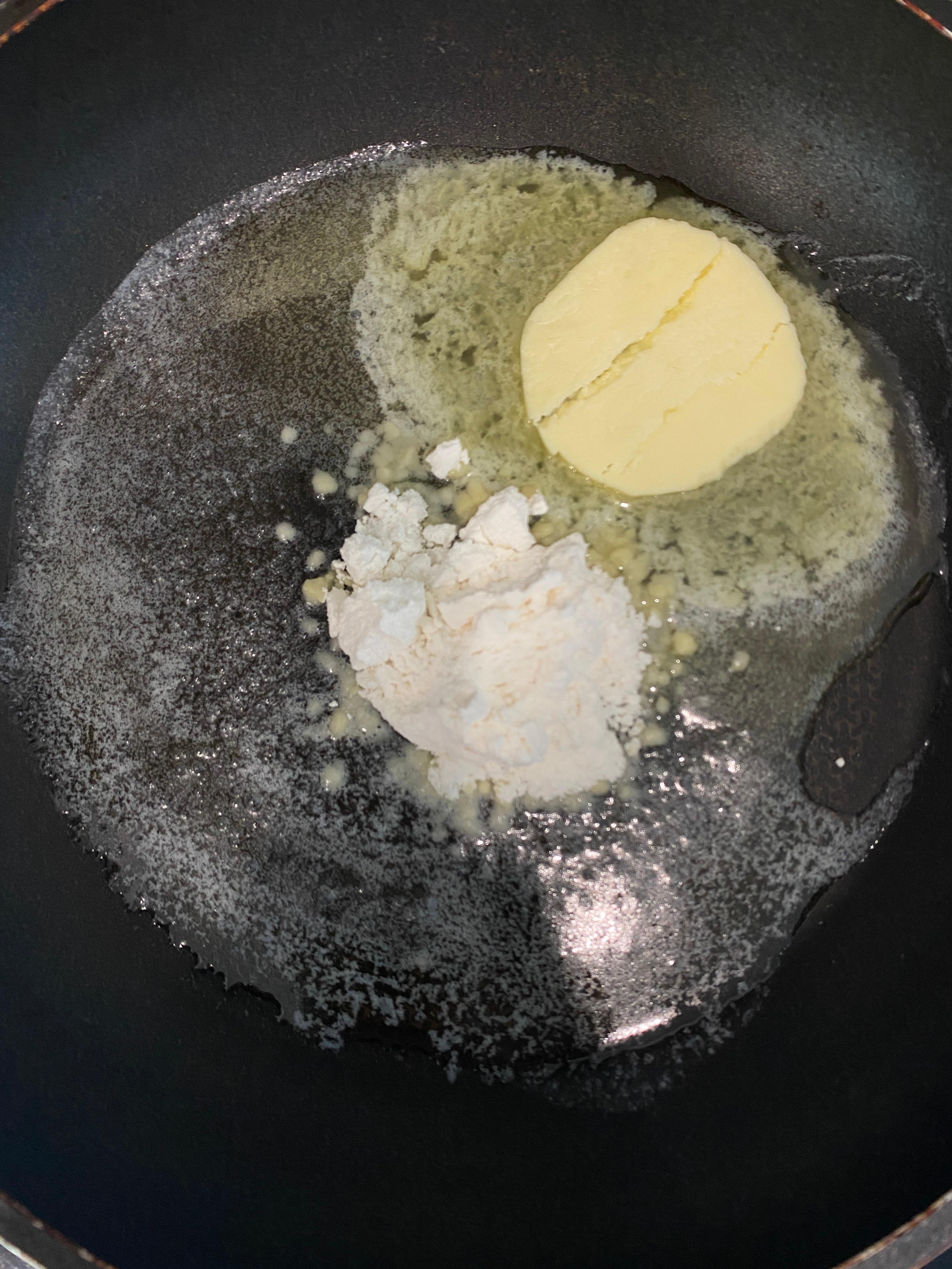2. 버터가 녹으면 밀가루 2큰술을 넣고 타지 않게 중 약불에서 약 2분간 볶습니다. 색이 살짝 노릇해질 때까지 볶아주세요