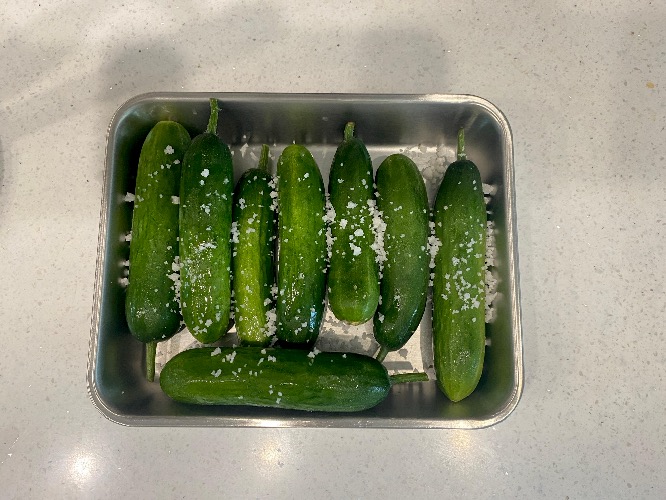 먼저 미니오이는 굵은 소금으로 박박 문질러 흐르는 물에 깨끗하게 닦아주었어요.