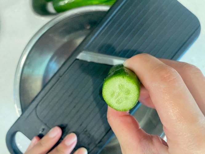 양 끝을 자르고, 반으로 갈라 이케아 채칼로 일정한 두께로 썰었어요. (뒷면 크기 2정도에서)