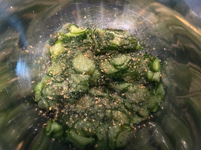 참기름과 깨소금을 절인 오이에 부은 뒤 살살 버무려요.